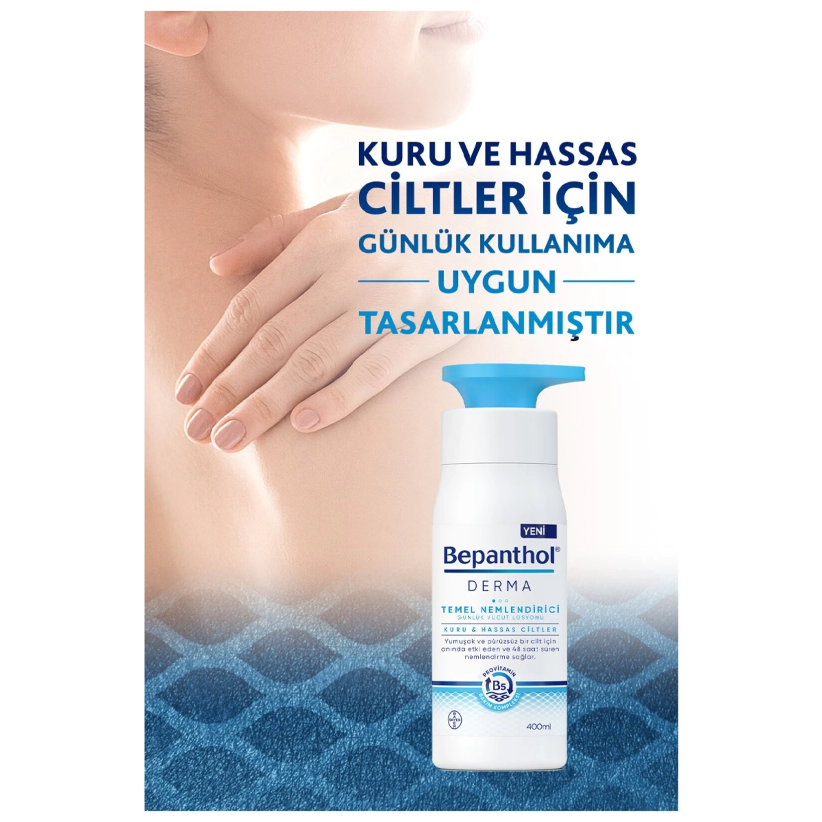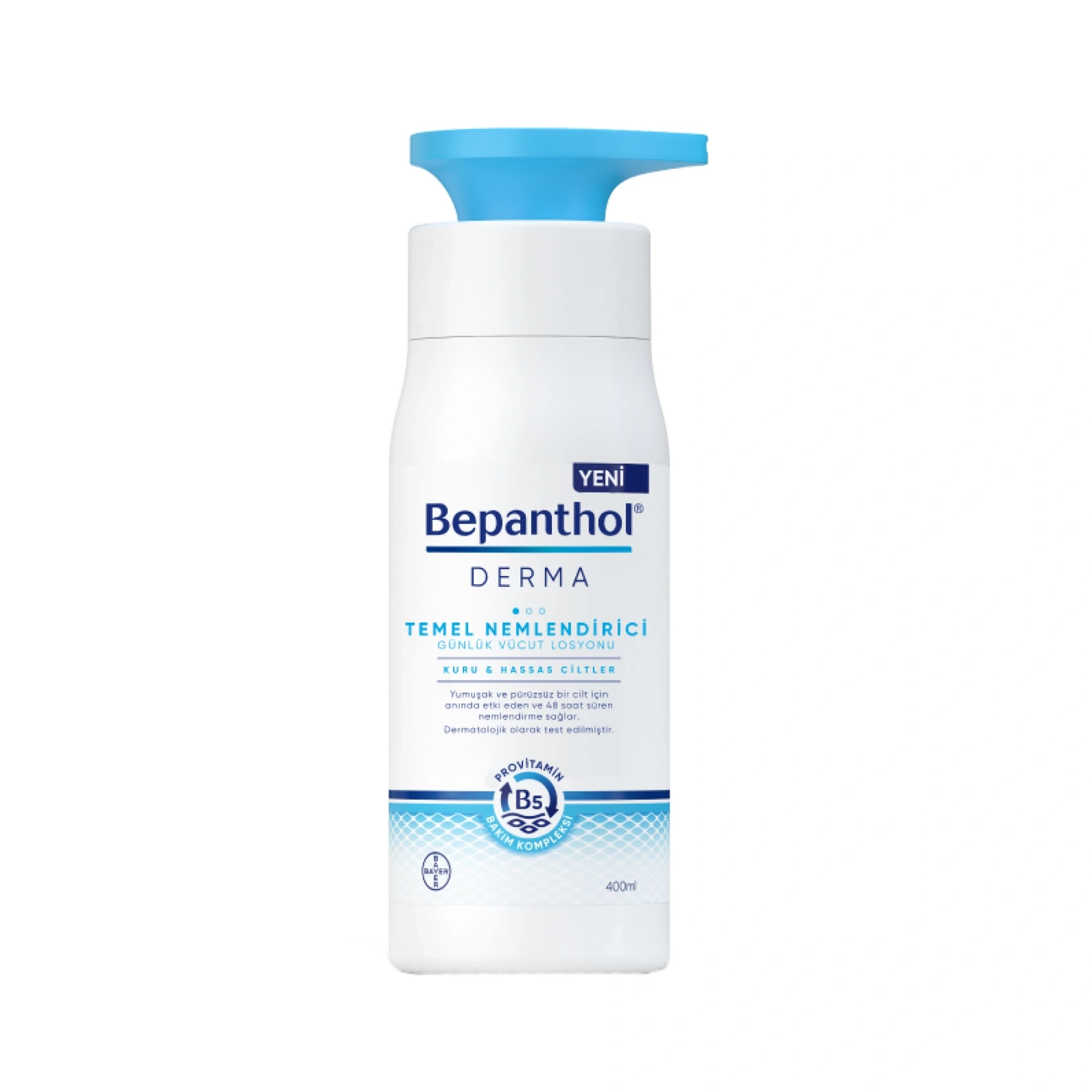 Yeni Bepanthol® Derma Temel Nemlendirici Vücut Losyonu, uzmanların onayladığı bileşenlerin özel kombinasyonuyla oluşan Provitamin B5 bakım kompleksine sahiptir. Provitamin B5 bakım kompleksi, cilt kuruluğu semptomlarını anında hafifletirken kuruluğun kaynağına inerek, cilt üzerinde uzun süreli kalıcı nemlendirme sağlar. Kuru ve hassas ciltlerin günlük kullanımına uygun olarak tasarlanmıştır.