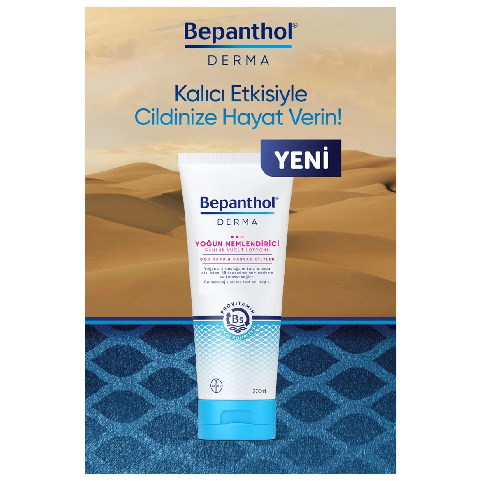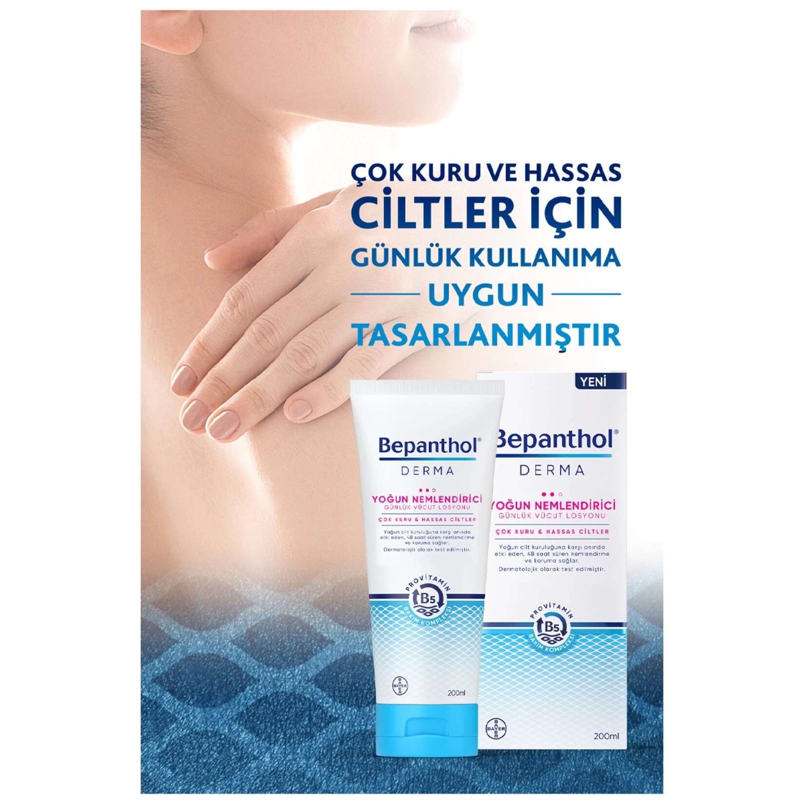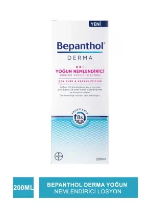 Bepanthol Derma Yoğun Nemlendirici Günlük Vücut Losyonu çok kuru ve hassas ciltler için geliştirilmiştir. İçeriğindeki Provitamin B5 Bakım Kompleksi kuruluğun temel kaynağına inerek 48 saat süren içten dışa kalıcı nemlendirme sağlar.Provitamin B5,Niasinamid, Shea Butter ,Argan yağı,Skualen, Gliserin, İzopropil İzostearat sayesinde cildi besler ,pürüzsüz ve yumuşak cilde sahip olmanızı sağlar.Tüm aile için uygundur. Dermatolojik olarak test edilmiştir.Günlük kullanıma uygundur.