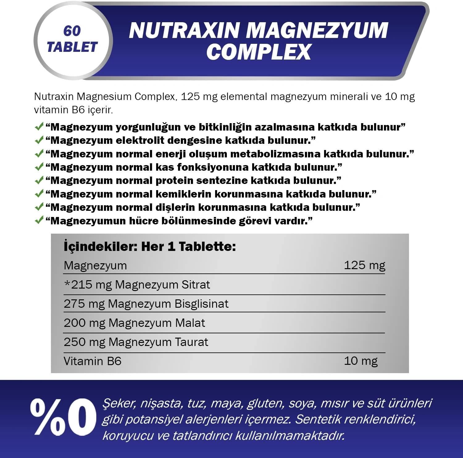 Her tablette 125 mg elementel magnezyum ile 10 mg B6 vitamini içeren Nutraxin Magnesium Complex, kas fonksiyonlarını desteklerken enerji metabolizmasına katkıda bulunur. Sentetik koruyucu veya tatlandırıcı içermeyen, vejetaryen dostu formülü sayesinde günlük mineral ihtiyacınızı pratik ve güvenilir biçimde karşılar.