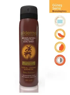 Alldermo Bronzlaştırıcı Güneş Yağı Kuru Sprey, güneş ışınlarının zararlı etkilerine karşı koruma sağlarken doğal ve eşit bir bronzluk elde etmenize yardımcı olur. Kuru sprey formu sayesinde yağlı his bırakmadan hızlıca emilir. İçeriğindeki besleyici yağlar cildi nemlendirir, yumuşatır ve parlak bir görünüm kazandırır. Suya dayanıklı yapısı sayesinde plajda veya havuzda rahatça kullanılabilir. Pratik spreyi ile kolay uygulama sunar. Hem güneş koruyucu hem de bronzlaştırıcı etkisiyle yaz aylarının vazgeçilmez bakım ürünlerinden biridir.