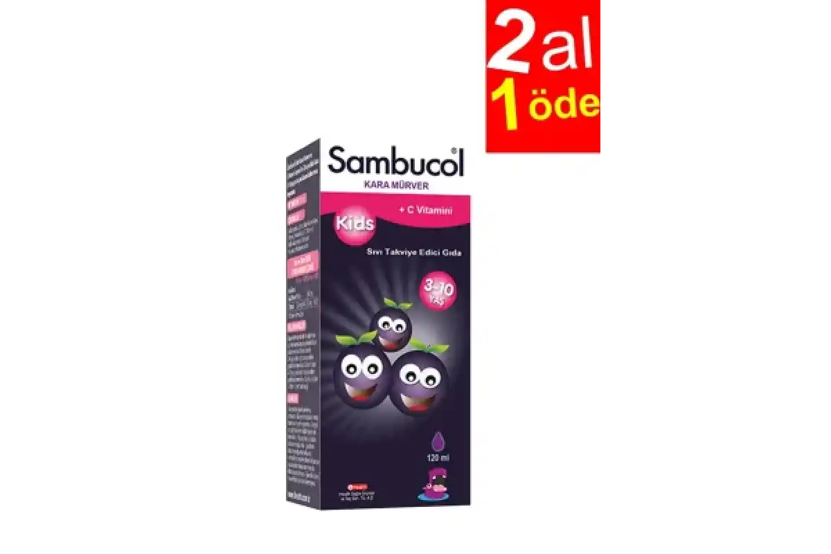 Sambucol Kids Kara Mürverli Şurup — çocuklar için özel olarak formüle edilmiş bir takviye edici gıda. C vitamini ve çinko içeriği ile bağışıklık sistemini desteklerken, lezzetli kara mürver meyve suyu ile çocukların damak tadına hitap eder.