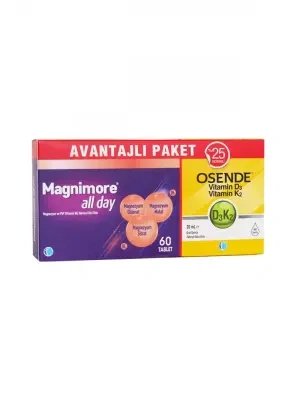 Tab İlaç Magnimore All Day 60 Tablet + Osende D3K2 20 ml Damla | Avantajlı Paket, günlük yaşamın yoğun temposuna ayak uydurmanıza yardımcı olmak için özel olarak formüle edilmiştir. İçeriğindeki bileşenler, hem fiziksel hem de zihinsel performansınızı desteklemeye yönelik seçilmiştir. Düzenli kullanımda bağışıklık sisteminin güçlenmesine, enerji seviyesinin yükselmesine ve genel yaşam kalitesinin artmasına katkı sağlar. Yetişkinler ve çocuklar için farklı formlarda sunulabilen bu ürün, güvenilir markaların kalite standartlarına uygun şekilde üretilmiştir. Kolay tüketim şekli ve etkili formülü sayesinde kullanıcı memnuniyeti oldukça yüksektir. Sağlıklı yaşamı desteklemek isteyen herkes için idealdir.