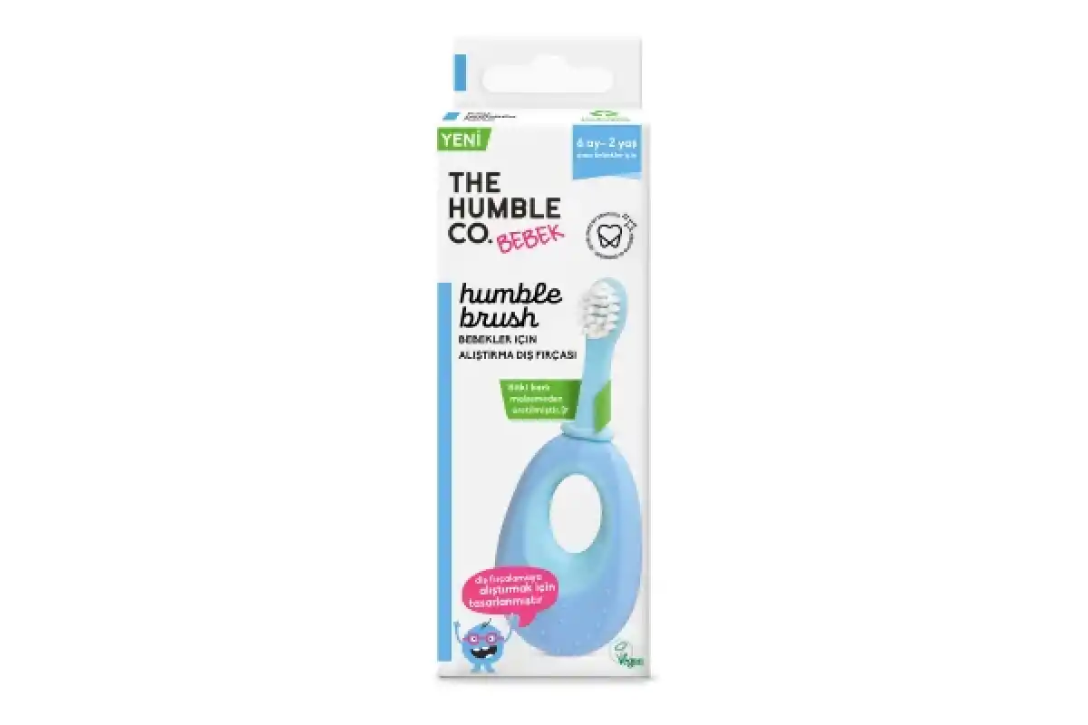 The Humble Co Humble Brush Plant Based Alıştırma Fırçası – Mavi, çevre dostu ve biyolojik olarak çözünür malzemelerden üretilmiş sap ile bebeklerin ve çocukların diş fırçalamaya alışmasını destekleyen yumuşak kıllara sahip sürdürülebilir bir diş fırçasıdır.
