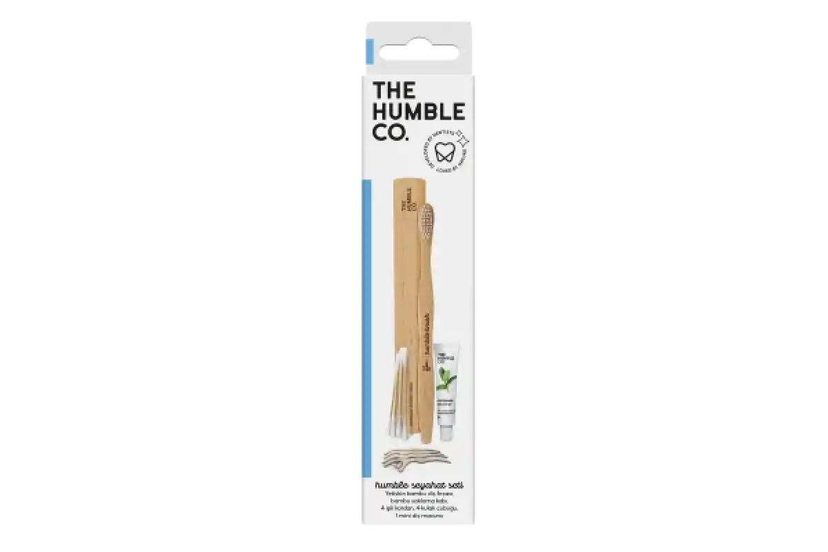 The Humble Co Seyahat Seti, seyahat sırasında ağız hijyeninizi korumak üzere tasarlanmış pratik bir bakım paketidir. Kompakt boyutlu olup bavulda veya çantada kolayca taşınabilir.
